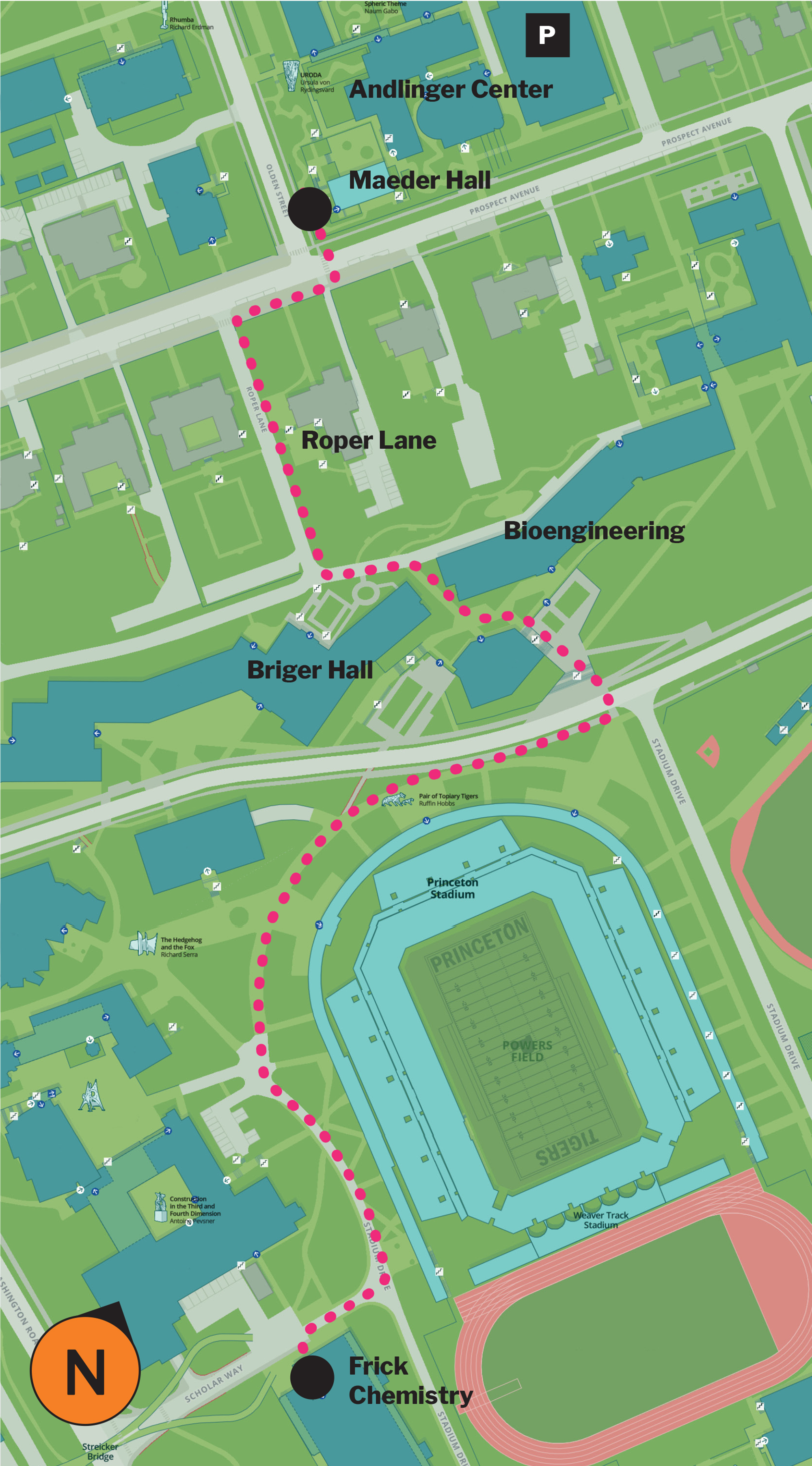 Members of the Andlinger Center staff will direct groups of people from Maeder Hall to Frick Chemistry Laboratory. This route will go through the newest section of the Princeton University campus: Briger Hall and the new engineering corridor. Staff will be carrying bright orange flags for visibility. A map of the route is available by clicking on the link or the image below.